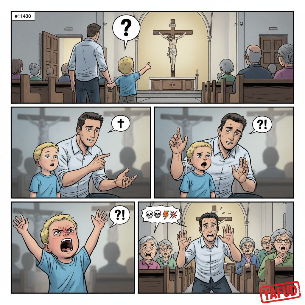 Leżę :D Oceniacie autora nie znając faktów. Może ma obrazy np z Maryją, może krzyż bez postaci Jezusa? Co wiadomo na pewno, wziął syna do kościoła, a mały wykazał wiele empatii :D "Nie sądźcie, abyście nie byli sądzeni":)