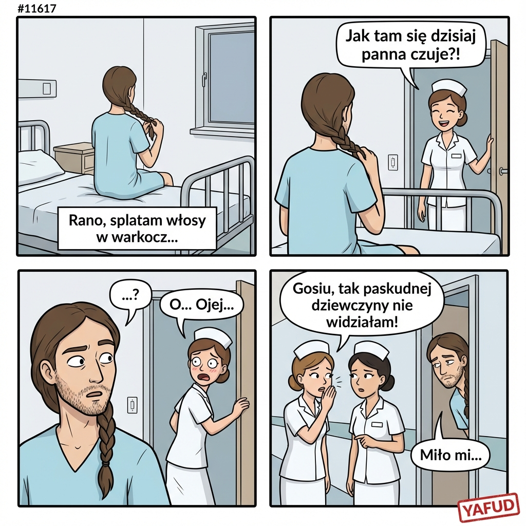 Akcja dzieje się w szpitalu - oddział chirurgii. Nie jestem specjalnie barczysty, mam długie włosy, które splatam dla wygody w warkocz, co też czyniłem z rana siedząc tyłem do drzwi. Nagle usłyszałem wesoły głos najwyraźniej nowej pielęgniarki: - Jak tam się dzisiaj panna czuje?! Odwróciłem się zdziwiony. Spojrzała na mój zarost i zrobiła głupią minę. Wyszła. Po Chwili usłyszałem jej szept na korytarzu: - Gosiu, łolaboga, tak paskudnej dziewczyny w życiu nie widziałam! Przecież to już obraza boska tak się zapuścić!... Nie powiem, miło mi... YAFUD«Poprzednia wpadkaNastępna wpadka »