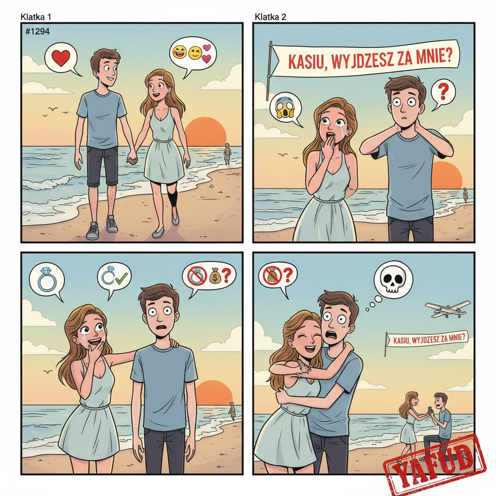 Dziś spacerowałem z dziewczyną, z którą jestem od półtora roku, po plaży. Wszystko było w porządku, póki nie zobaczyła samolotu ciągnącego za sobą baner "Kasiu, wyjdziesz za mnie?". Odpowiedziała "tak". To nie ja zamówiłem ten samolot. YAFUD«Poprzednia wpadkaNastępna wpadka »