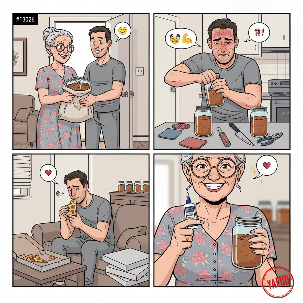 Nie załapałem co jest yafudem. To że mąż nic nie umie? A może to że zasyfił mieszkanie? Czy też pomysł teściowej z zaklejaniem słoików?