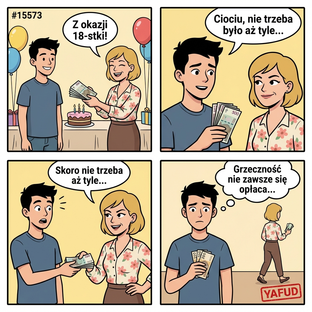 7Hahaa... cioteczka pierwsza klasa. :D Ciesz się, że w ogóle dostałeś dwie stówy.;]