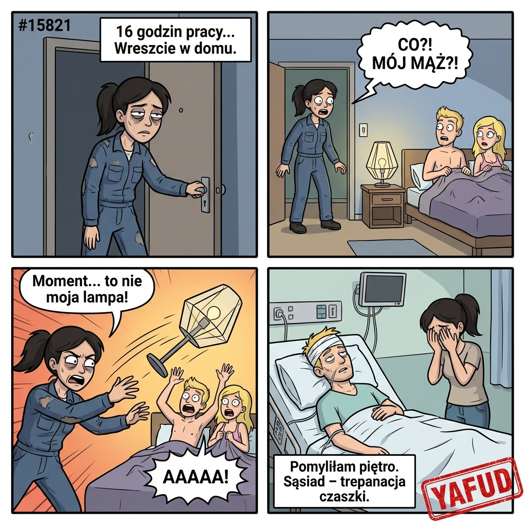 Dobre:D nie rozumiem jak mozna nie rozpoznac wlasnych drzwi z mieszkania (no chyba ze na pietrze wszyscy maja takie same) ale samo wejscie do mieszkania juz swiadczy o tym ze to nie moje lokum ...no i ten maz...wlasnego meza nie poznajesz? ja mojego ze wszystkich stron i wszedzie poznaje nie ma opcji zeby pomylic. a Ty tu piszesz ze w locie zorientowalas sie ze to nie twoja lampa i lozko...:D:Dhmm:P