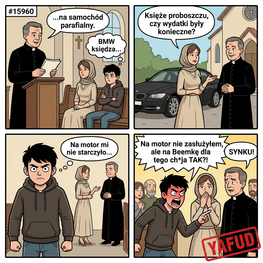 39''W pewnej chwili padło: "Na samochód parafialny", czyli potocznie "BMW księdza".'' tu się powinien skończyć YAFUD. Twój brat jest - o ironio - jedyną względnie mądrą osobą i doprawdy nie mam pojęcia, co chciałaś przekazać - aż tak zj*balo Ci dzień usłyszenie z ust brata prawdy o swoim idealnym księżulku?