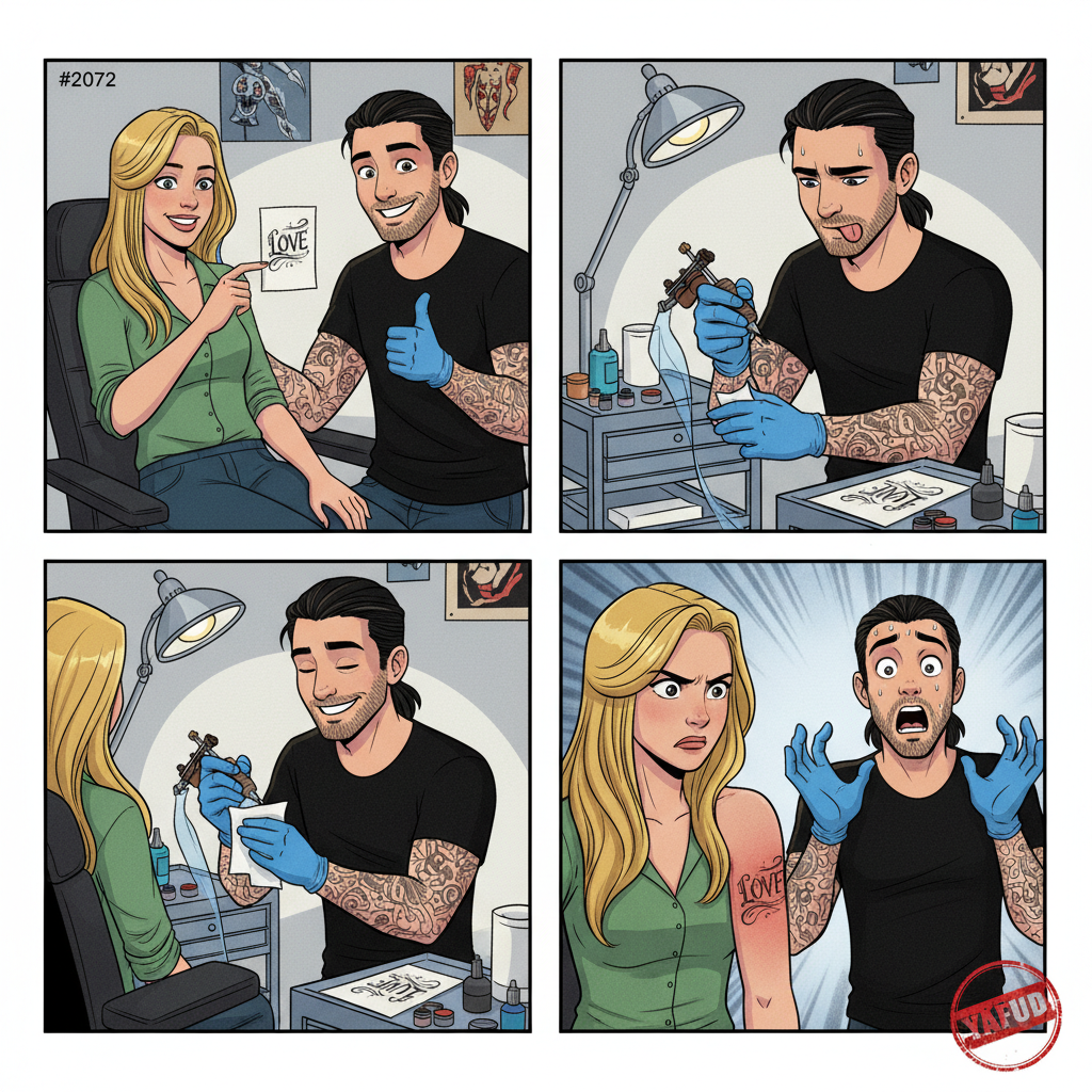 Nie rozumiem tylko 1 jak można zrobić literówkę w tatuażu? przecież najpierw robisz jego szkic, sprawdzasz, potem odbijasz na skórze, sprawdzasz, i dopiero zaczynasz ,,rzeźbić". Przepraszam ale albo jesteś skrajnym idiotą, albo masz totalnie w dupie swoją pracę. No istnieje trzecia możliwość że byłeś tego dnia skrajnie zmęczony, ale człowieku wtedy bierze się dzień urlopu lub sprawdza X10 razy!