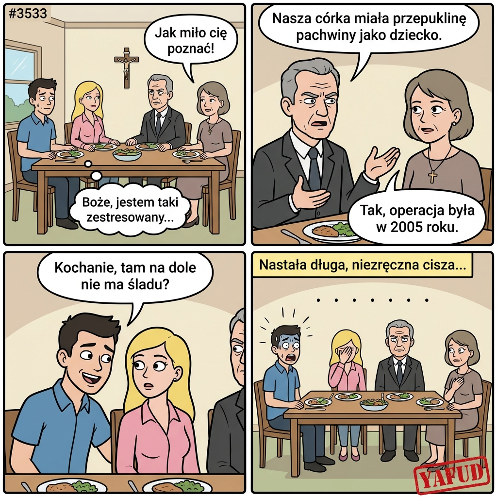 Byłem dziś po raz pierwszy na obiedzie u rodziców mojej dziewczyny. Są mocno religijni i w ogóle tacy ę, ą. Jakoś tak wyszło, że rozmowa zeszła na operację przepukliny pachwiny, którą moja dziewczyna przeszła w dzieciństwie. Chcąc podtrzymać konwersację wypaliłem: "Nigdy mi o tym nie mówiłaś kochanie, tam na dole nie ma po tym śladu?. Wtedy nastała długa, niezręczna cisza. YAFUD«Poprzednia wpadkaNastępna wpadka »