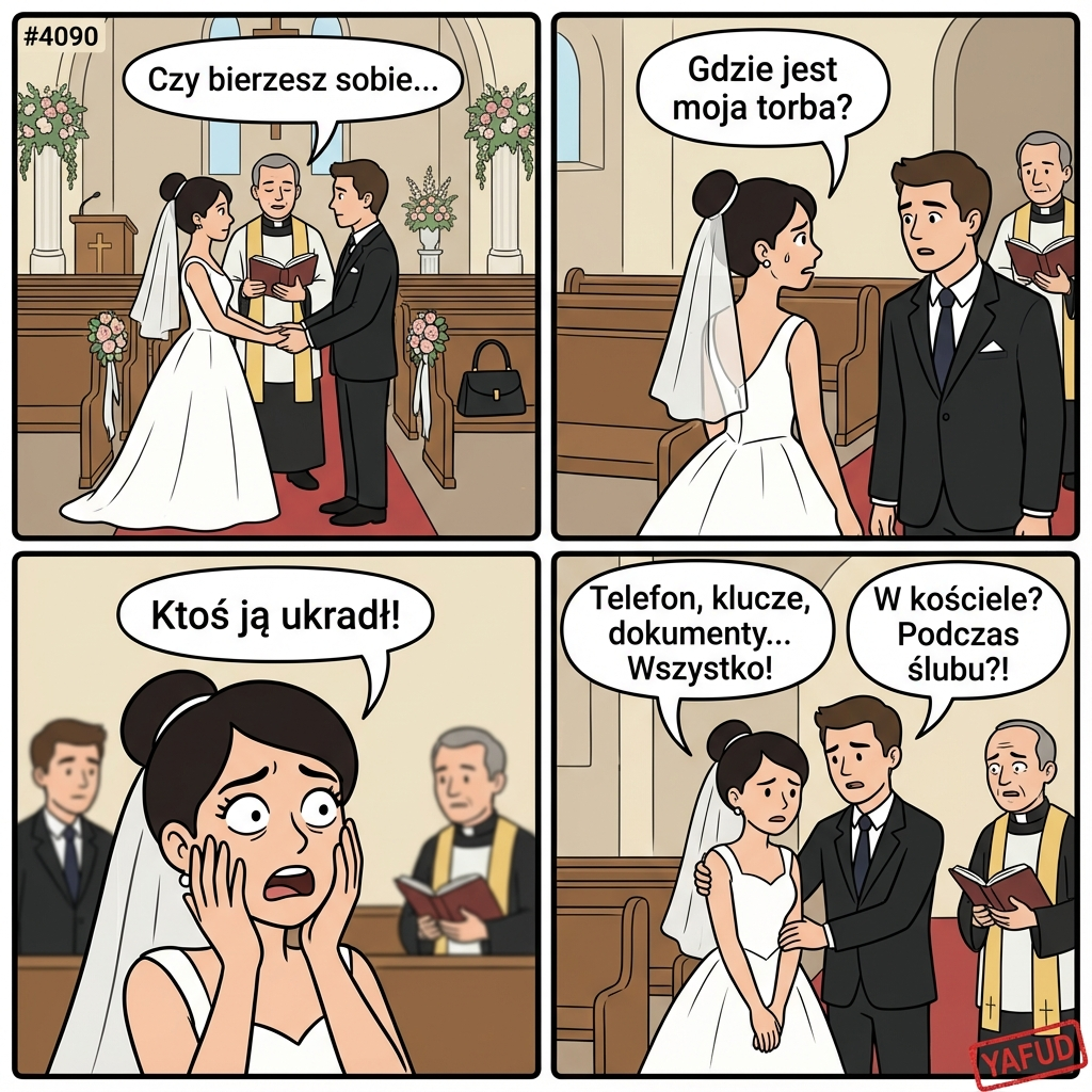 Ukradziono mi torbę, w której miałam telefon, klucze do domu i samochodu, pieniądze i karty oraz dokumenty. W kościele... Podczas mojego własnego ślubu. YAFUD«Poprzednia wpadkaNastępna wpadka »
