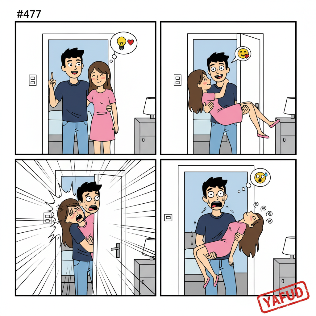 Dzisiaj w końcu przekonałem moją dziewczynę, żeby poszła ze mną do łóżka. Postanowiłem być romantyczny i zanieść ją do sypialni, jak na filmach. Niosąc ją, źle wymierzyłem, przywaliłem jej głową o futrynę i straciła przytomność. YAFUD«Poprzednia wpadkaNastępna wpadka »