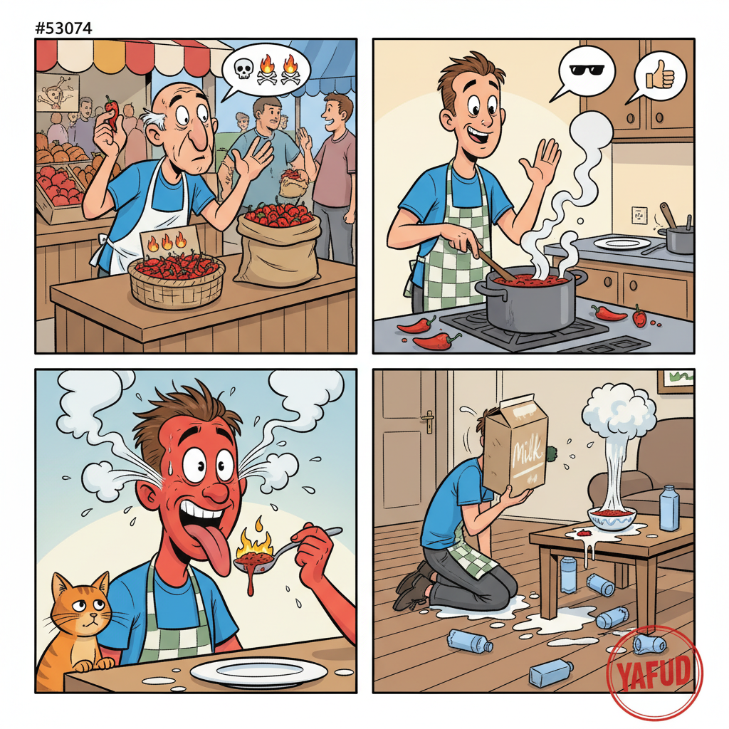 Kupiłem na targu "bardzo ostre papryczki". Zrobiłem z nich sos do obiadu, ignorując ostrzeżenia sprzedawcy. Po pierwszym kęsie czułem się, jakbym lizał słońce. Resztę wieczoru spędziłem z ustami w kartonie z mlekiem. YAFUD«Poprzednia wpadkaNastępna wpadka »