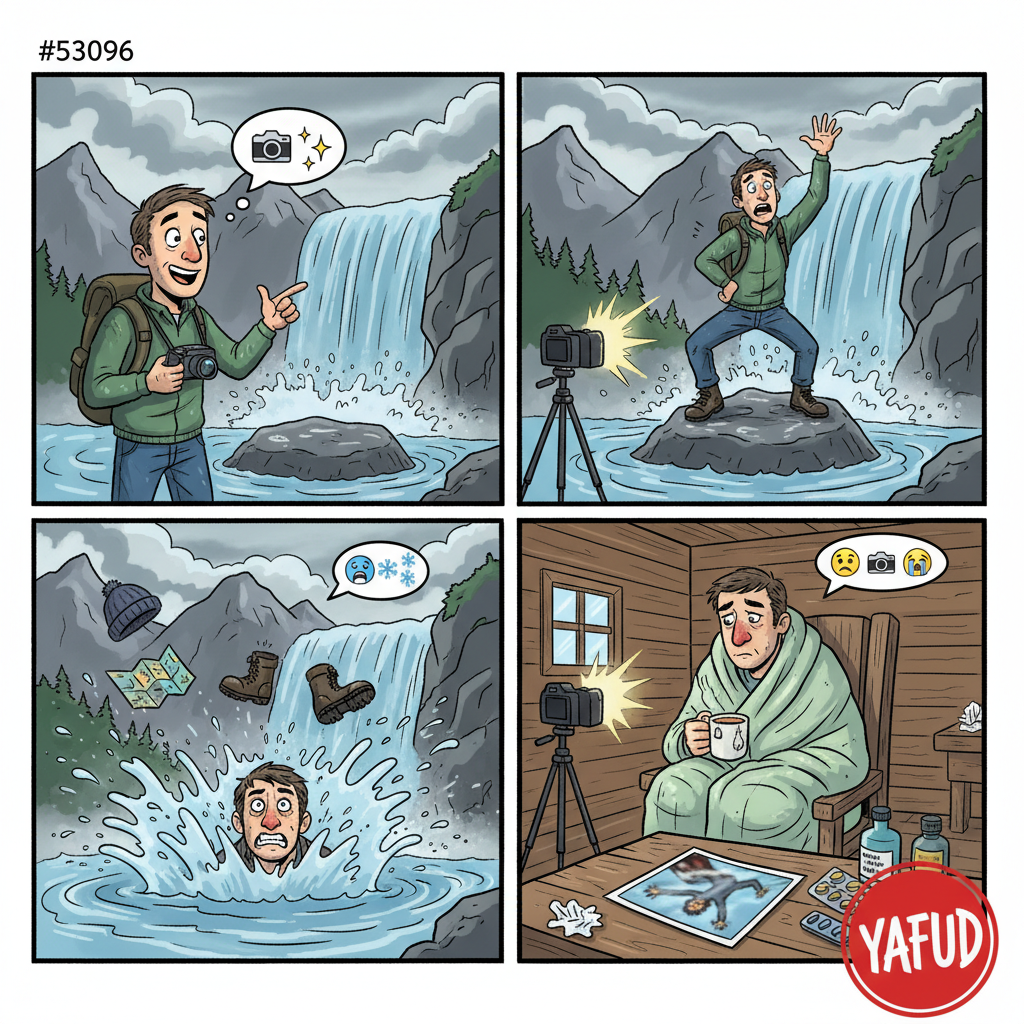 Na wycieczce w górach, chciałem zrobić sobie zdjęcie przy wodospadzie. Poślizgnąłem się na mokrym kamieniu i wpadłem do lodowatej wody. Zdjęcie wyszło bardzo "dynamiczne". Na domiar złego dzień nie był zbyt pogodny, więc solidnie wymarzłem i przez resztę wakacji walczyłem z choróbskiem. YAFUD«Poprzednia wpadkaNastępna wpadka »
