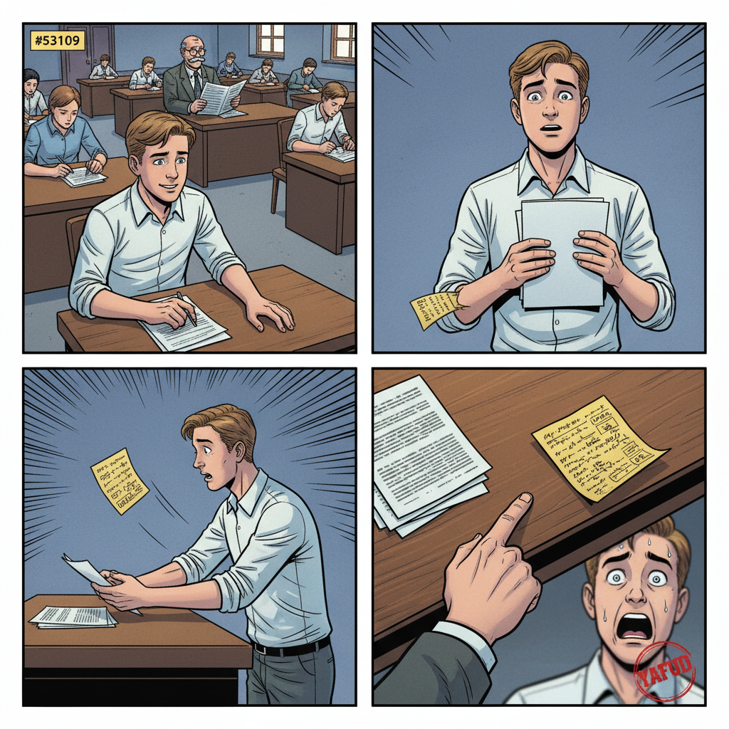 Na egzaminie, ściąga, którą miałem w rękawie, wypadła mi prosto na biurko profesora w momencie kiedy oddawałem pracę. YAFUD«Poprzednia wpadkaNastępna wpadka »