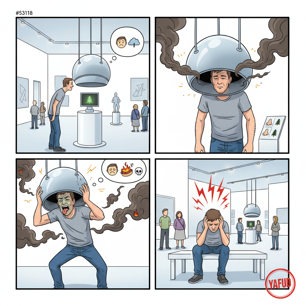 Na wystawie interaktywnej, gdzie można było "doświadczyć sztuki zmysłami", włożyłem głowę do specjalnego hełmu, który miał emitować "zapach lasu". Niestety, system się zepsuł i poczułem zapach spalonej kiełbasy. Zapach był tak okropny, że kiedy już udało mi się uwolnić z tego przeklętego hełmu to dostałem migreny na resztę dnia. YAFUD«Poprzednia wpadkaNastępna wpadka »