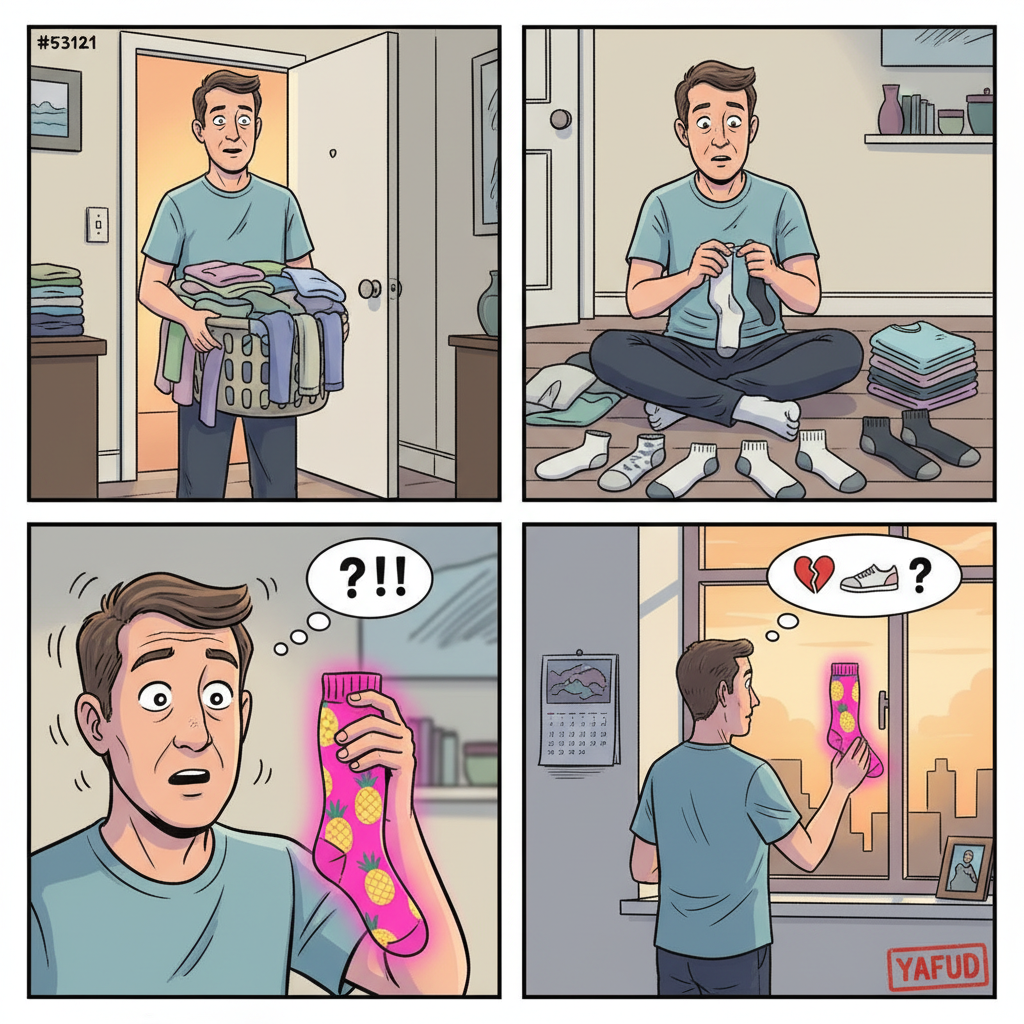 Po powrocie z pralni samoobsługowej, podczas sortowania ubrań, okazało się, że mam jedną skarpetkę więcej, niż miałem. Była wściekle różowa i w ananasy. Do dziś zastanawiam się, kto stracił tak wspaniałą skarpetkę. YAFUD«Poprzednia wpadkaNastępna wpadka »