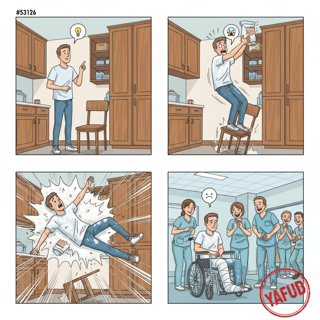Chciałem wyjąć coś z najwyższej szafki, stając na krześle. Krzesło się zachwiało, a ja, próbując złapać równowagę, złapałem za torebkę z mąką. Spadłem z krzesła, tak niefortunnie że złamałem nogę, a na SOR pojechałem cały upaprany mąką. YAFUD«Poprzednia wpadkaNastępna wpadka »