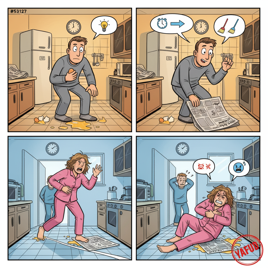 Poślizgnęłam się w kuchni i upadłam tak, że solidnie potłukłam dwa żebra. Okazuje się, że mój chłop upuścił wieczorem jajko w kuchni. Zamiast je posprzątać przykrył je gazetą, żeby posprzątać później... ale oczywiście tego nie zrobił. Ja rano wstaję jako pierwsza i wchodząc do kuchni nie spodziewałam się takich niespodzianek. YAFUD«Poprzednia wpadkaNastępna wpadka »