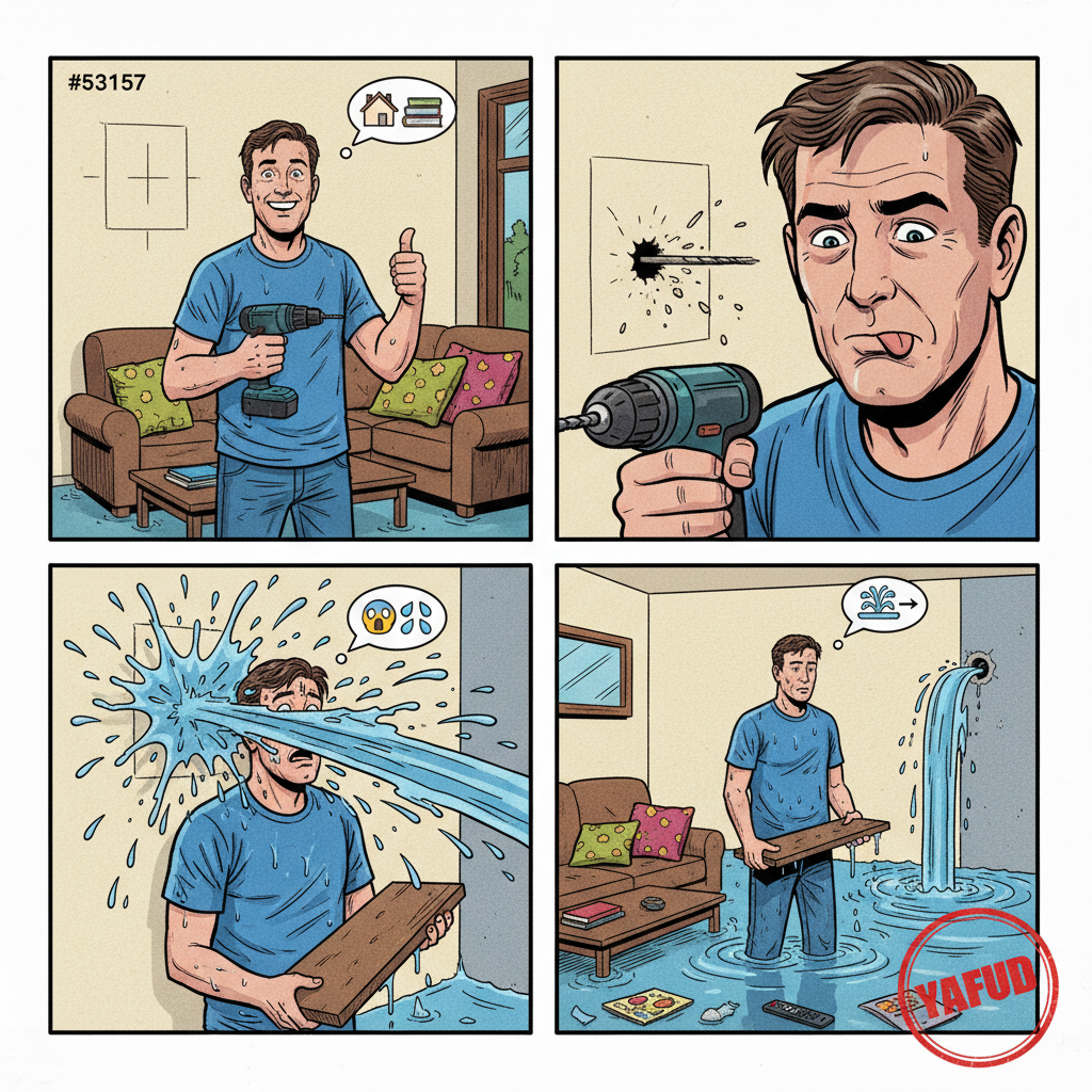 Chciałem powiesić półkę. Wiercąc dziurę, trafiłem w rurę z wodą. Zamiast półki, miałem w ścianie fontannę. YAFUD