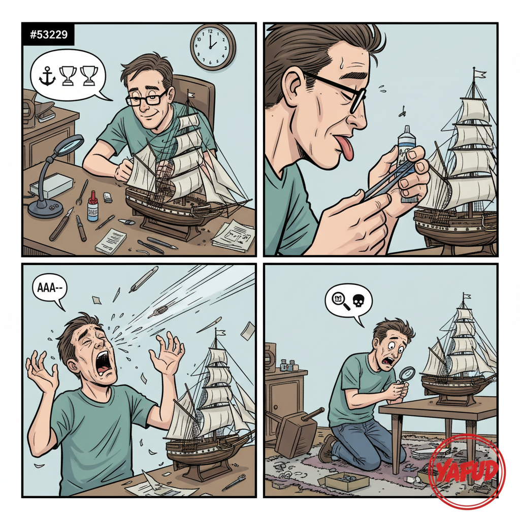 Sklejałem misterny model statku. Po wielu godzinach pracy, gdy miałem już przykleić ostatni, najmniejszy element, kichnąłem. Element wyleciał w powietrze i nigdy więcej go nie zobaczyłem. YAFUD«Poprzednia wpadkaNastępna wpadka »