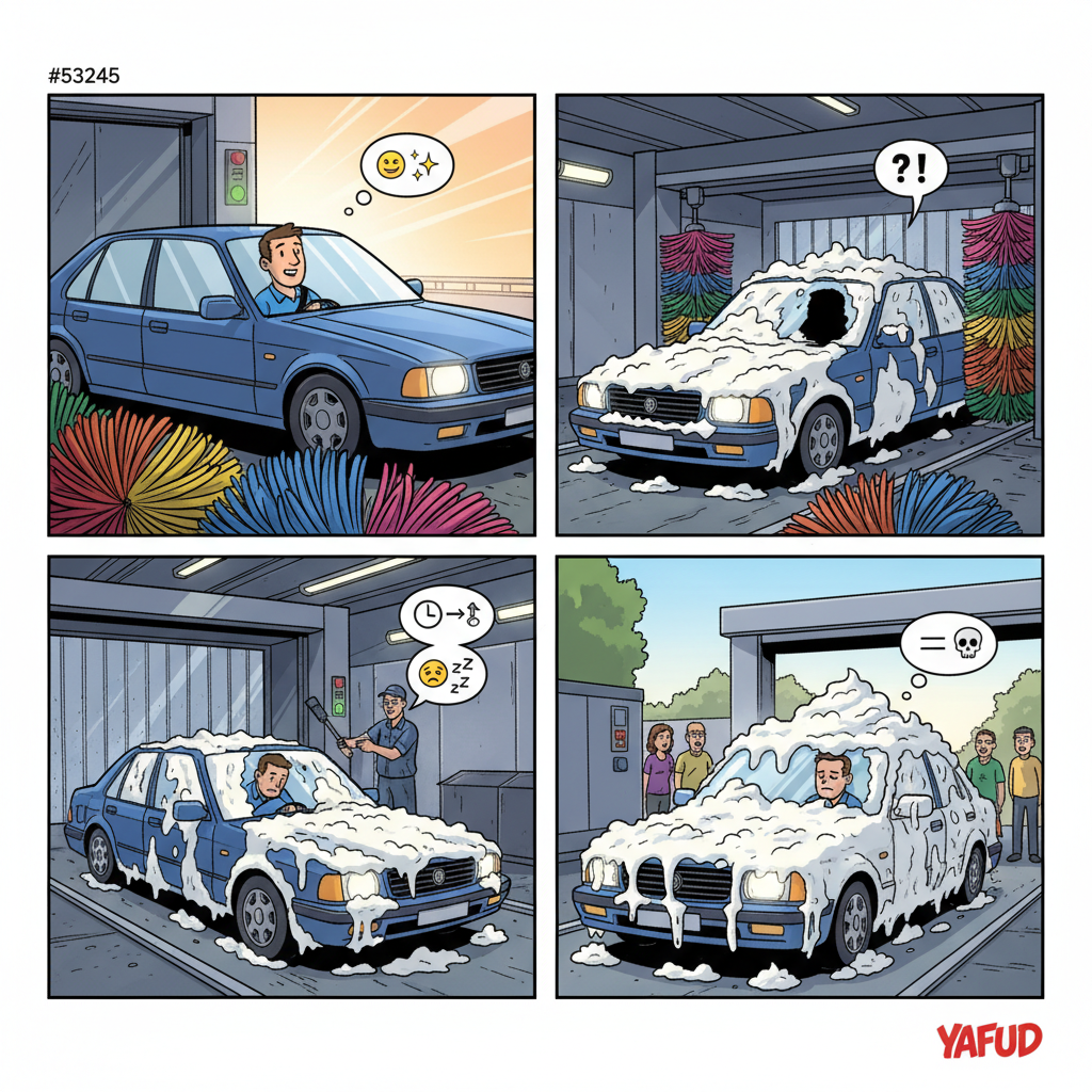 W sobotni poranek postanowiłem wypróbować nową myjnię automatyczną. Z dumą wjechałem moim lśniącym (jeszcze) autem, zapłaciłem kartą i uruchomiłem program 'premium z woskowaniem'. W połowie mycia, cały w pianie, nagle wszystko ucichło. Prąd wysiadł. Awaria w całej dzielnicy. Siedziałem zamknięty w ciemnej, mokrej puszce przez prawie dwie godziny, aż w końcu pracownik myjni uwolnił mnie ręcznie, otwierając bramę. Kiedy wreszcie wyjechałem, moje auto wyglądało jak gigantyczna, niedokończona beza - białe od zaschniętej piany, z zaciekami. YAFUD«Poprzednia wpadkaNastępna wpadka »