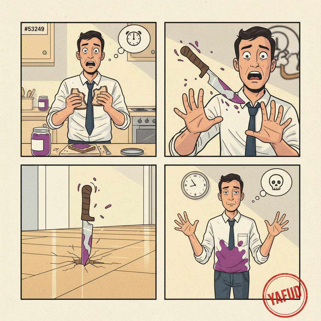 Wczoraj rano, spiesząc się do pracy, chciałem szybko zjeść kanapkę z dżemem. W pośpiechu, nóż z resztką dżemu wyślizgnął mi się z ręki. Wylądował idealnie pionowo, wbijając się ostrzem w nowiutkie panele podłogowe, a rączką ubrudzoną dżemem pacnął w moją białą koszulę. Stałem przez chwilę, patrząc na ten pomnik mojego porannego pecha. YAFUD«Poprzednia wpadkaNastępna wpadka »