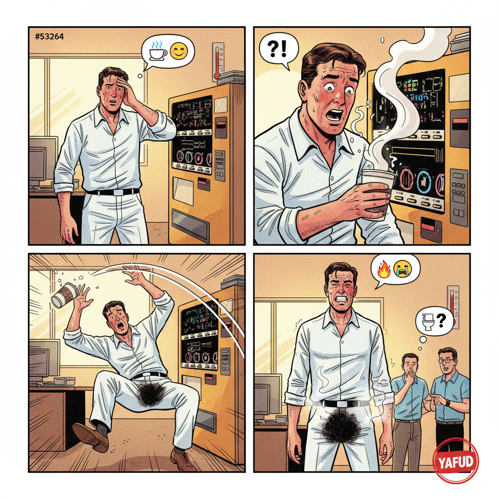 W upalny dzień postanowiłem schłodzić się w pracy, kupując mrożoną kawę z automatu. Zamiast kawy, automat wydał mi kubek gorącej wody. Kiedy próbowałem go odstawić, żeby zgłosić awarię, potknąłem się o własne nogi i wylałem wrzątek na nowe, białe spodnie. Wyglądałem, jakbym nie zdążył do toalety, a plama piekła niemiłosiernie. YAFUD«Poprzednia wpadkaNastępna wpadka »