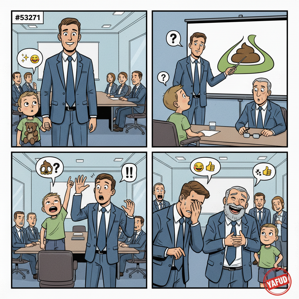 Pracuję w korpo i mieliśmy dzień 'przynieś swoje dziecko do pracy'. Mój syn, lat 6, był zachwycony. W czasie najważniejszej prezentacji dla klienta, kiedy na ekranie pojawił się slajd z naszym nowym logo, mój syn krzyknął na całą salę: 'Tato, a dlaczego to logo wygląda jak kupa w trawie?'. Zapadła grobowa cisza, a klient wybuchnął śmiechem. YAFUD«Poprzednia wpadkaNastępna wpadka »