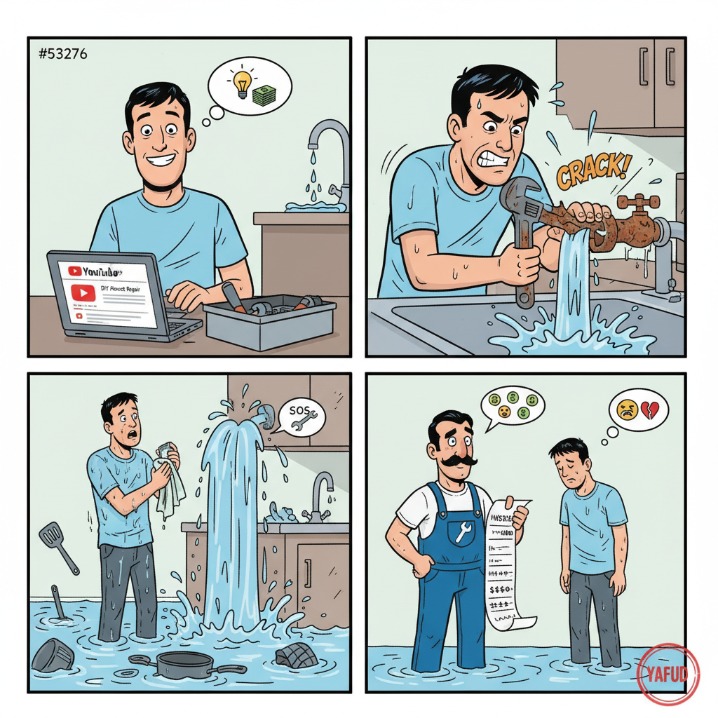 W ramach oszczędności postanowiłem sam naprawić cieknący kran w kuchni. Obejrzałem kilka tutoriali na YouTube i czułem się jak profesjonalista. Zakręciłem główny zawór wody, ale okazało się, że był stary i zardzewiały - ukręciłem go. Woda zaczęła lać się ciurkiem. W panice zadzwoniłem po hydraulika. Przyjechał, spojrzał na mnie, na zawór i powiedział: 'No, to teraz będzie drożej niż za wymianę kranu'. YAFUD«Poprzednia wpadkaNastępna wpadka »