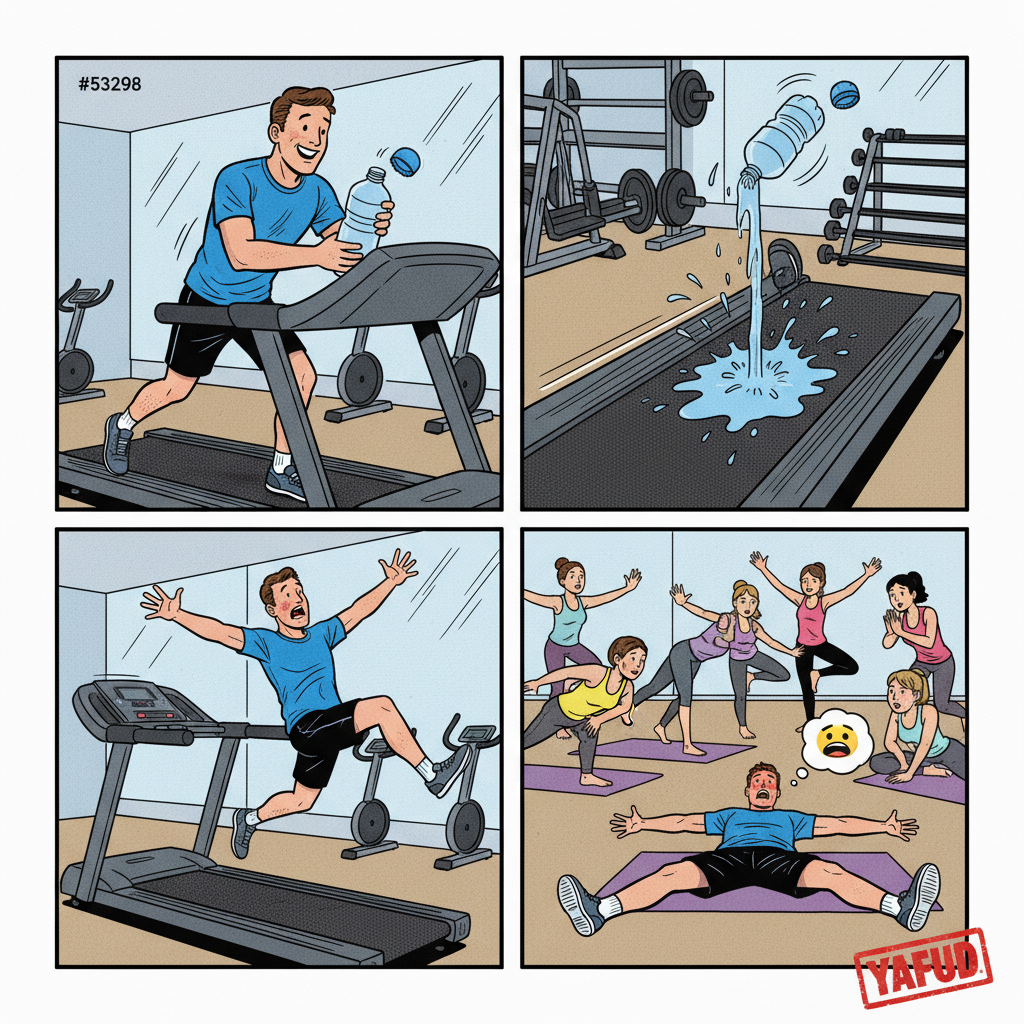 Na siłowni postanowiłem pobiegać na bieżni. Położyłem butelkę z wodą w uchwycie, ale była źle zakręcona. Woda wylała się na pas, ja się poślizgnąłem i zjechałem z bieżni tyłem, lądując u stóp grupki ludzi ćwiczących jogę. YAFUD«Poprzednia wpadkaNastępna wpadka »