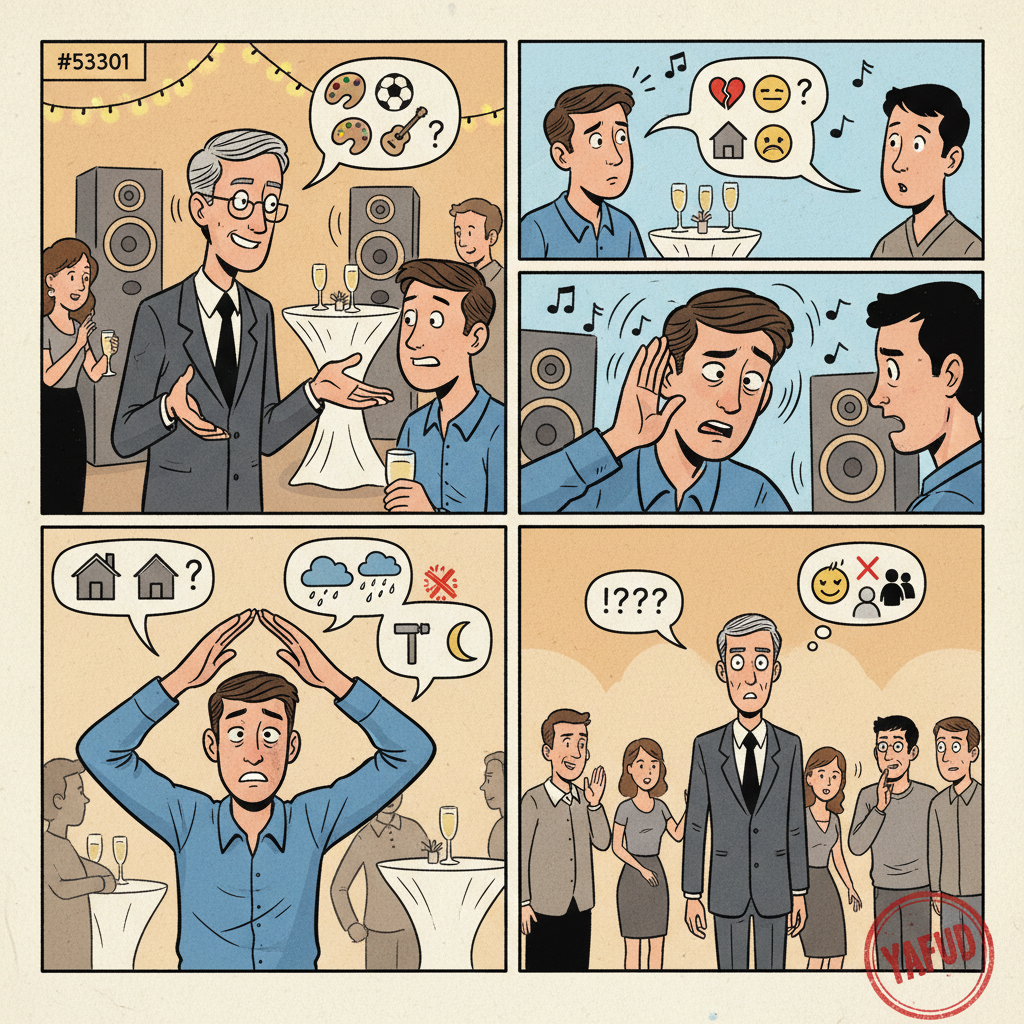 Na przyjęciu firmowym rozmawiałem z nowym dyrektorem. W tle grała głośna muzyka, a on zapytał mnie o moje hobby. Ja, słysząc 'Jakie masz kłopoty?', zacząłem mu z przejęciem opowiadać o moim cieknącym dachu i hałaśliwym sąsiedzie z góry. YAFUD«Poprzednia wpadkaNastępna wpadka »