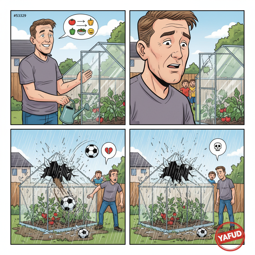 Postanowiłem zająć się ogrodnictwem i zbudowałem małą szklarnię na podwórku. Spędziłem tygodnie przygotowując glebę, sadząc nasiona pomidorów, ogórków i papryki, i starannie dbając o delikatne sadzonki. Każdego ranka wychodziłem, aby sprawdzić ich postępy, czując się jak dumny rodzic obserwujący, jak rosną w siłę. Rośliny kwitły, a ja już marzyłem o pysznych, domowych warzywach, które wkrótce będę zbierać. Pewnego popołudnia zobaczyłem dzieci sąsiada grające w piłkę na swoim podwórku. Nie przejąłem się tym zbytnio, dopóki nie usłyszałem głośnego trzasku. Wybiegłem na zewnątrz i zobaczyłem dziurę wielkości piłki nożnej w szklanym dachu mojej szklarni. Potłuczone szkło spadło prosto na moje najbardziej obiecujące krzaki pomidorów, miażdżąc je. Jakby tego było mało, tego wieczoru zaczęło mocno padać. Deszcz lał się przez dziurę, zalewając szklarnię i topiąc resztę moich biednych sadzonek. Mój sen o letniej sałatce z własnych upraw został zastąpiony przez smutny widok błotnistej, zasłanej szkłem ruiny. YAFUD«Poprzednia wpadkaNastępna wpadka »