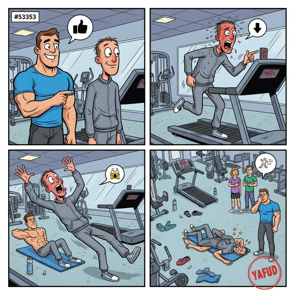 Poszedłem na siłownię po raz pierwszy od lat. Trener pokazał mi, jak obsługiwać bieżnię. Wszystko wydawało się proste, więc zacząłem biec. Po dwóch minutach chciałem zwolnić, ale pomyliłem przyciski i przyspieszyłem do maksimum. Spaść mogłem tylko w tył, prosto na faceta robiącego brzuszki. Obaj wylądowaliśmy na podłodze, a ja już nigdy tam nie wróciłem. YAFUD«Poprzednia wpadkaNastępna wpadka »