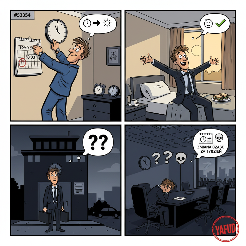 Umówiłem się z szefem na ważne spotkanie o 10:00. Dzień wcześniej przestawiłem zegarki na czas letni. Obudziłem się spokojnie o 8:00, zjadłem śniadanie i pojechałem do biura. Dopiero tam dowiedziałem się, że czas letni zaczyna się za tydzień, a ja przyszedłem dwie godziny za wcześnie. Siedziałem samotnie w pustym biurze, czekając na resztę. YAFUD«Poprzednia wpadkaNastępna wpadka »