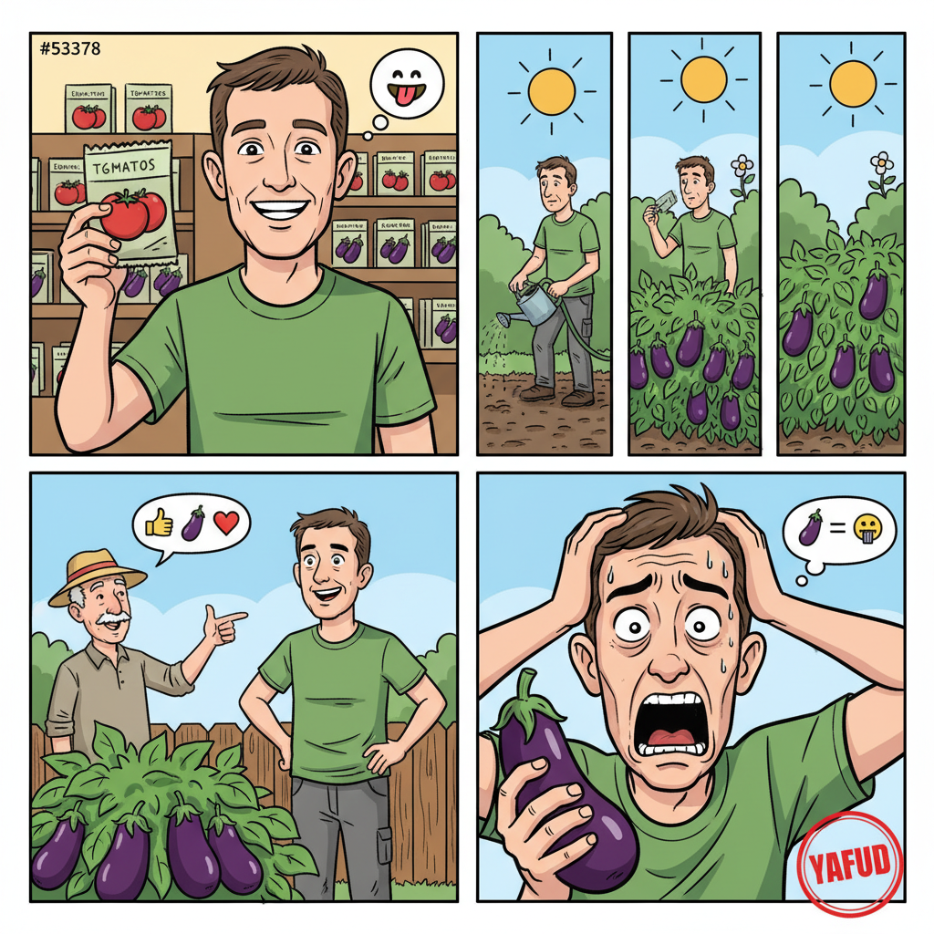 Postanowiłem zasadzić w ogródku pomidory. Przez trzy miesiące pielęgnowałem rośliny, podlewałem je, nawożiłem. Wreszcie pojawiły się pierwsze owoce. Sąsiad przyszedł pogratulować mi pięknych... oberżyn. Okazało się, że w sklepie pomyliłem nasiona. Nie lubię oberżyn. YAFUD«Poprzednia wpadkaNastępna wpadka »