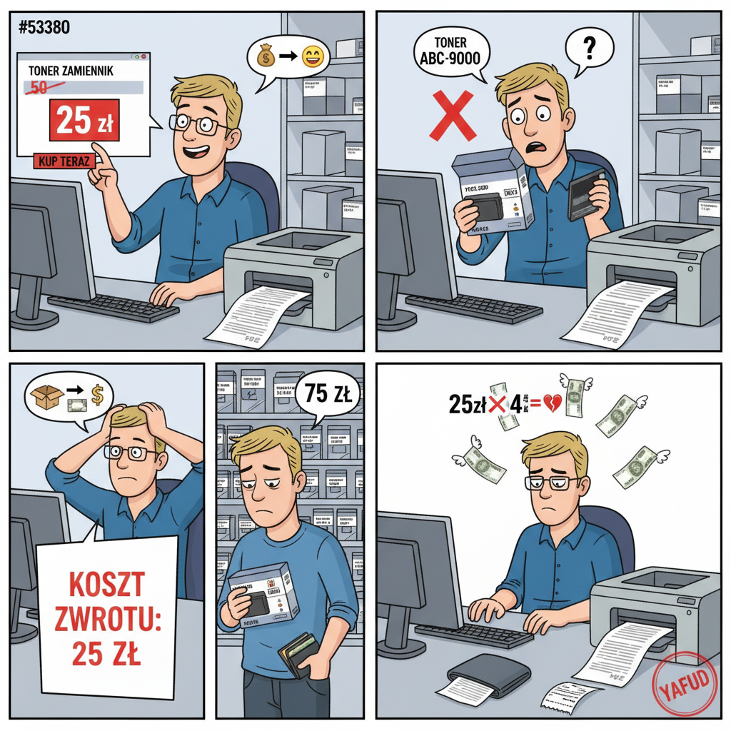 Zamówiłem przez internet tani zamiennik tonera do drukarki. Gdy przyszła paczka, okazało się, że toner jest do zupełnie innego modelu. Zwrot kosztował tyle samo, co sam toner. Kupiłem więc oryginalny za trzy razy wyższą cenę. W sumie wydałem na toner cztery razy więcej, niż planowałem. YAFUD«Poprzednia wpadkaNastępna wpadka »