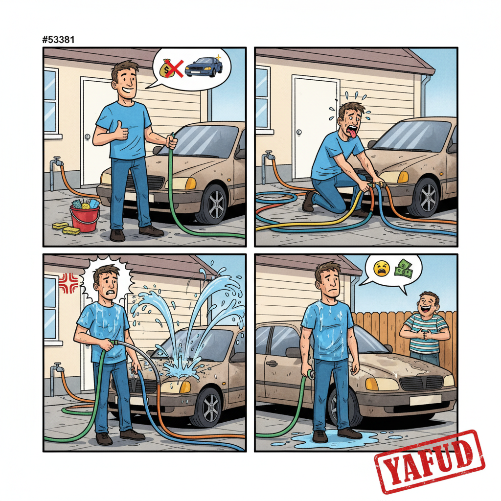 Postanowiłem oszczędzić na myjni i umyć samochód sam, w domu. Wąż ogrodowy okazał się za krótki, więc dokładałem kolejne przedłużki. W końcu ruszyłem z myciem. Ciśnienie było tak małe, że woda ledwo ciekła. Za to połączenia wężów co chwilę się rozłączały i oblewałem siebie. Po godzinie byłem mokry, zmęczony, a samochód był umyty tylko z jednej strony. YAFUD«Poprzednia wpadka