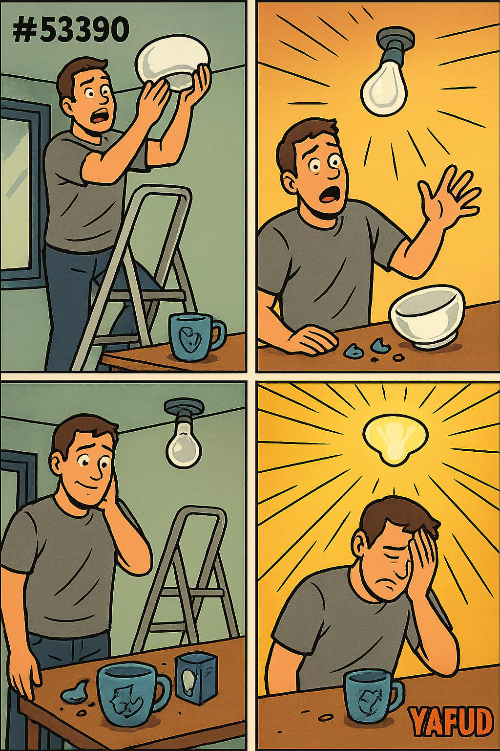 Postanowiłem zaoszczędzić i sam wymienić żarówkę w lampie sufitowej. Wdrapałem się na drabinę, odkręciłem klosz i upuściłem go prosto na stół. Klosz przeżył, ale rozbił się mój ulubiony kubek, który stał na stole. Wymieniłem żarówkę, zszedłem z drabiny i dopiero wtedy zorientowałem się, że kupiłem żarówki o złej mocy. YAFUD«Poprzednia wpadkaNastępna wpadka »