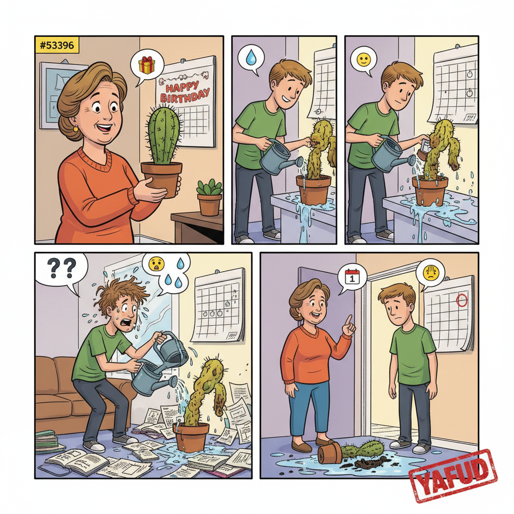 Moja mama kupiła mi na urodziny roślinę doniczkową, mówiąc że 'to stuletnik, przeżyje wszystko'. Postawiłem go na parapecie i podlewałem zgodnie z instrukcją. Po tygodniu liście zaczęły żółknąć. Przeczytałem w internecie, że może dostawać za dużo słońca. Przeniosłem do cienia - zaczął więdnąć. Podlałem bardziej - zaczął gnić. Mama przyszła w odwiedziny, spojrzała na roślinę i zapytała, co ja z nią robiłem. Okazało się, że kupiła mi kaktusa, który trzeba podlewać raz na miesiąc, a ja robiłem to dwa razy w tygodniu. YAFUD«Poprzednia wpadkaNastępna wpadka »