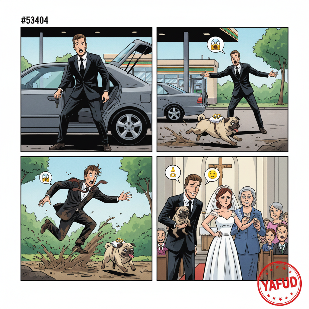 Moja siostra poprosiła mnie, żebym przywiózł na jej ślub jej mopsa, który miał być drużbą niosącym obrączki. Miał je przyczepione do małej poduszeczki na grzbiecie. Droga była prosta, więc zatrzymałem się na chwilę na stacji benzynowej. W tym momencie pies, który nienawidzi jeździć samochodem, wykorzystał okazję. Wyskoczył przez uchylone okno i uciekł w stronę pobliskiego parku. Następną godzinę, ubrany w garnitur, biegałem po błocie, goniąc mopsa. W końcu go złapałem, ale był cały ubłocony, a poduszeczka z obrączkami zniknęła. Dotarłem do kościoła spóźniony, trzymając brudnego psa, ale bez obrączek. Siostra musiała pożyczyć pierścionek od teściowej. Obrączki znalazło dwa dni później jakieś dziecko bawiące się w parku. YAFUD«Poprzednia wpadka