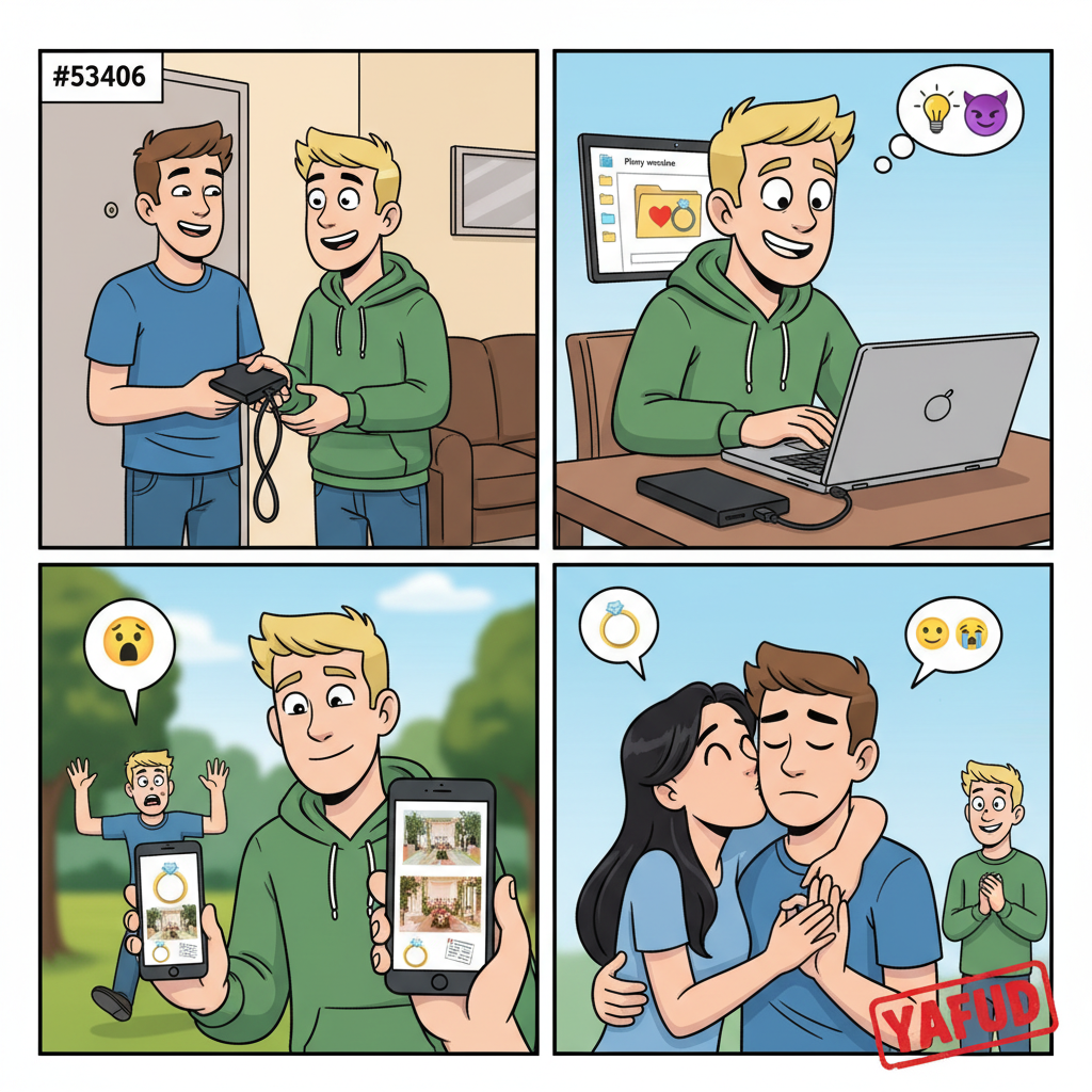 Pożyczyłem koledze dysk zewnętrzny, żeby zgrał sobie parę filmów. Zapomniałem, że na dysku był też folder o nazwie „Plany weselne”, w którym od miesięcy potajemnie przygotowywałem zaręczyny z moją dziewczyną. Mój kolega znalazł go i, myśląc, że to świetny żart, pokazał wszystko mojej dziewczynie, zanim zdążyłem się oświadczyć. Powiedziała „tak”, ale cała niespodzianka poszła na marne. YAFUD«Poprzednia wpadkaNastępna wpadka »