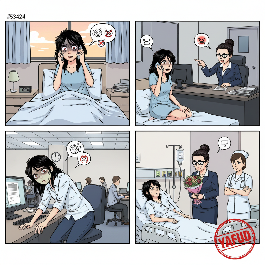 W ogóle nie spałam w nocy, z jakiegoś powodu nie mogłam zasnąć. Rano zadzwoniłam do szefowej, żeby powiedzieć, że nie dam rady przyjść do pracy, bo ledwo się na nogach trzymam. Szefowa stwierdziła że to wymówka i mam natychmiast przyjść, jak nie, to zwolni mnie dyscyplinarnie. Przyszłam, ale po godzinie straciłam przytomność i obudziłam się w szpitalu. YAFUD«Poprzednia wpadka