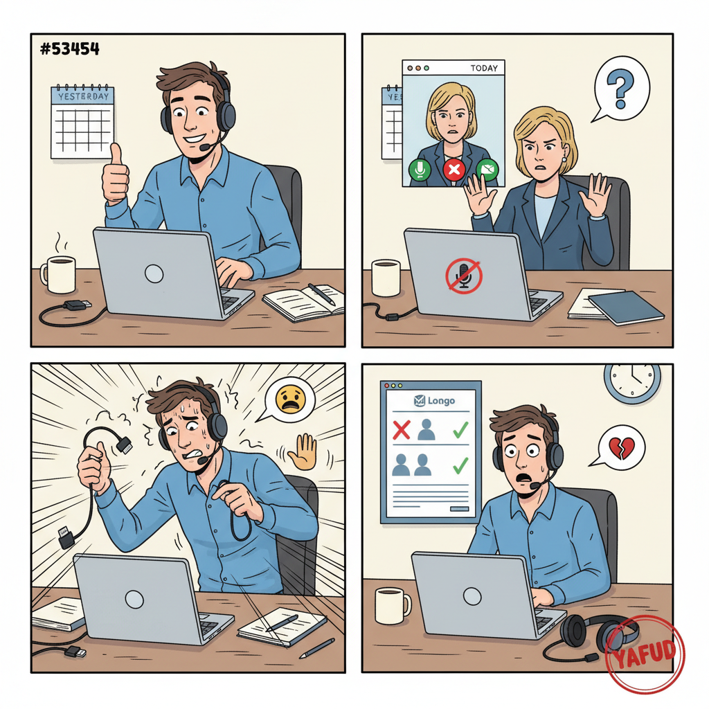 Miałem ważną rozmowę kwalifikacyjną online. Sprawdziłem mikrofon i kamerę dzień wcześniej - wszystko działało. W dniu rozmowy włączyłem komputer i dołączyłem do spotkania. Rekruterka mnie widziała, ale nie słyszała. Przez 10 minut próbowałem naprawić mikrofon na różne sposoby. W końcu zaproponowała, żeby odłożyć rozmowę. Godzinę później napisała, że zdecydowali się na innego kandydata. YAFUD«Poprzednia wpadka
