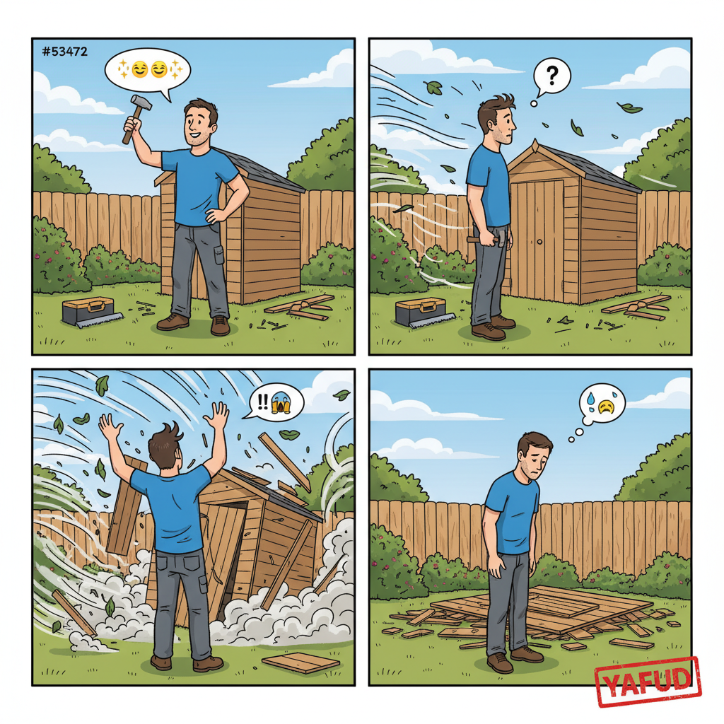 Postanowiłem wreszcie zadbać o ogródek i zbudować małą szopę na narzędzia. Poświęciłem na to cały weekend, posiłkując się instrukcją z internetu. Kiedy wbiłem ostatni gwóźdź i z dumą spojrzałem na konstrukcję, nagle zerwał się potężny wiatr. Szopa, która wyglądała tak solidnie, okazała się być bardziej domkiem z kart. Złożyła się w płaską stertę desek w ciągu kilku sekund. YAFUD«Poprzednia wpadkaNastępna wpadka »