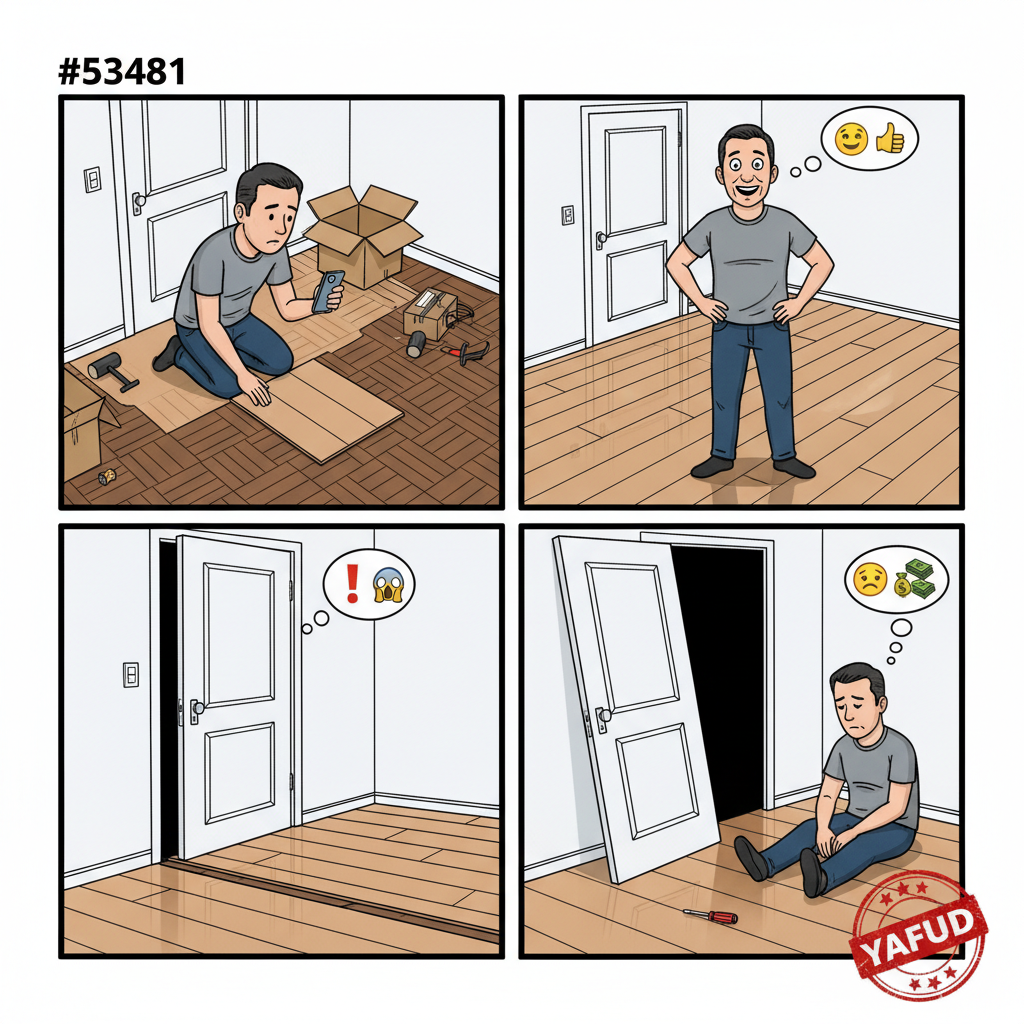 Postanowiłem samodzielnie położyć panele w salonie, żeby zaoszczędzić. Po całym weekendzie spędzonym z tutorialami na YouTube byłem dumny ze swojego dzieła. Do momentu, aż spróbowałem zamknąć drzwi do pokoju. Okazało się, że podłoga jest teraz za wysoka. Musiałem zdjąć drzwi i teraz czekam na stolarza, żeby je przyciął. YAFUD«Poprzednia wpadkaNastępna wpadka »
