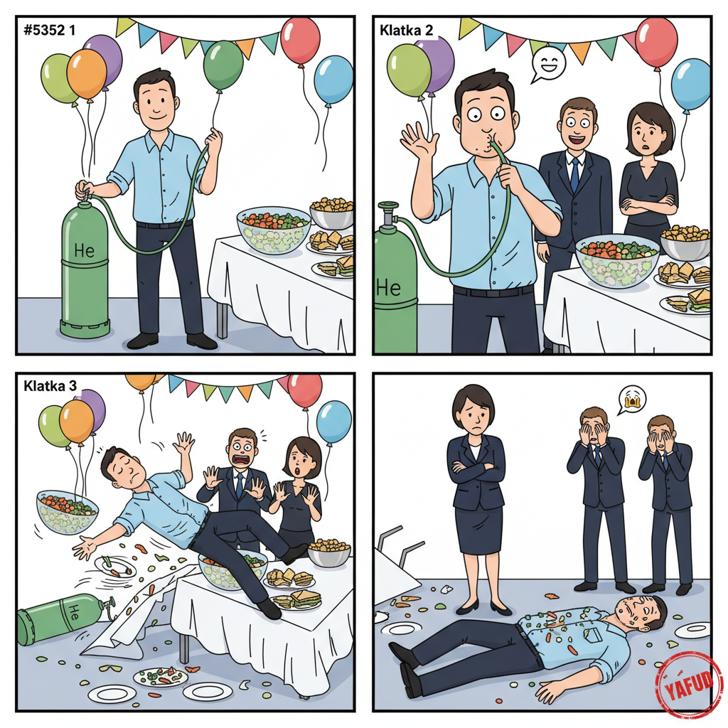 Zgłosiłem się na ochotnika do pompowania balonów na imprezę firmową. Używaliśmy butli z helem. Chciałem rozbawić towarzystwo i pociągnąłem trochę helu, żeby zmienić głos. Okazało się, że mam jakąś dziwną nadwrażliwość i momentalnie zrobiło mi się słabo. Zemdlałem i upadając, pociągnąłem za sobą stół z cateringiem. Obudziłem się cały w sałatce jarzynowej, a szefowa patrzyła na mnie z politowaniem. YAFUD«Poprzednia wpadka
