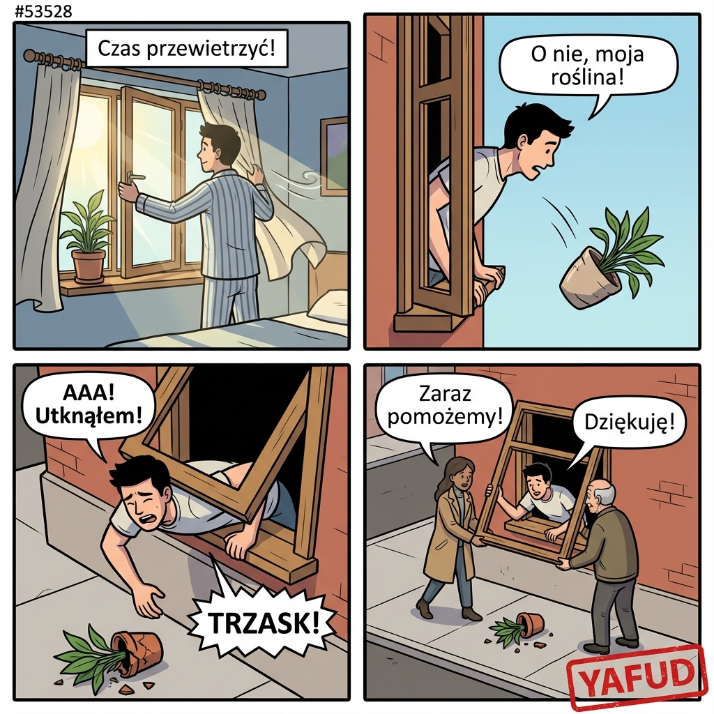 Mieszkam na parterze i rano zazwyczaj otwieram okno, żeby przewietrzyć sypialnię. Dziś, kiedy się ubierałem, wiatr zdmuchnął z parapetu moją ulubioną roślinę doniczkową. Wyrzuciłem głowę przez okno, żeby zobaczyć, czy doniczka ocalała. W tym momencie okno, które nie było zablokowane, opadło z impetem prosto na moje plecy. Utknąłem pętlą gilotynową w połowie pasa. Przechodnie musieli mi pomagać się wydostać, bo sam nie mogłem unieść ramy. YAFUD«Poprzednia wpadkaNastępna wpadka »