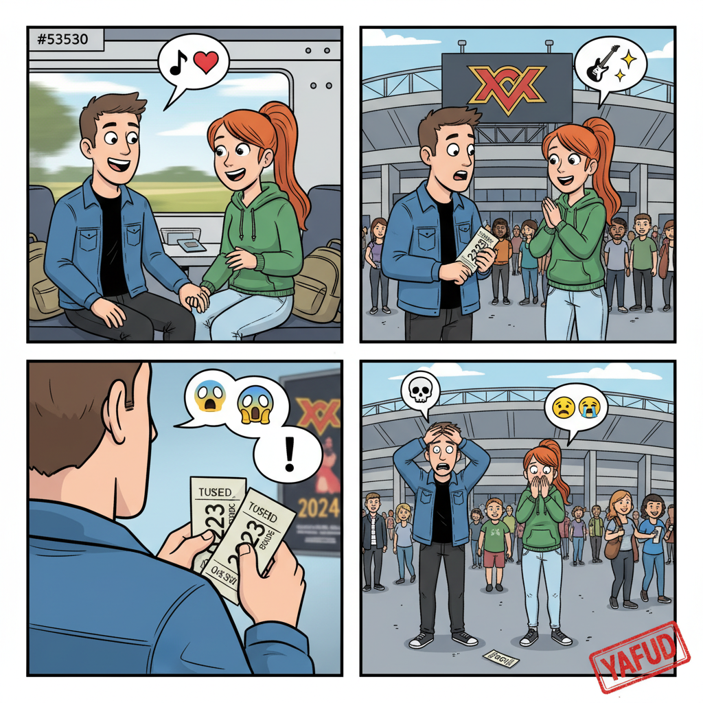 Kupiłem bilety na koncert mojego ukochanego zespołu w innym mieście. Wzięliśmy z dziewczyną wolne w pracy i pojechaliśmy pociągiem. Na miejscu, przed wejściem na stadion, wyciągnąłem bilety z kieszeni. Okazało się, że wzięliśmy bilety na koncert, który odbył się rok temu – mieliśmy je na pamiątkę przypięte na lodówce obok nowych. Te właściwe zostały w domu, 300 kilometrów stąd. YAFUD«Poprzednia wpadka