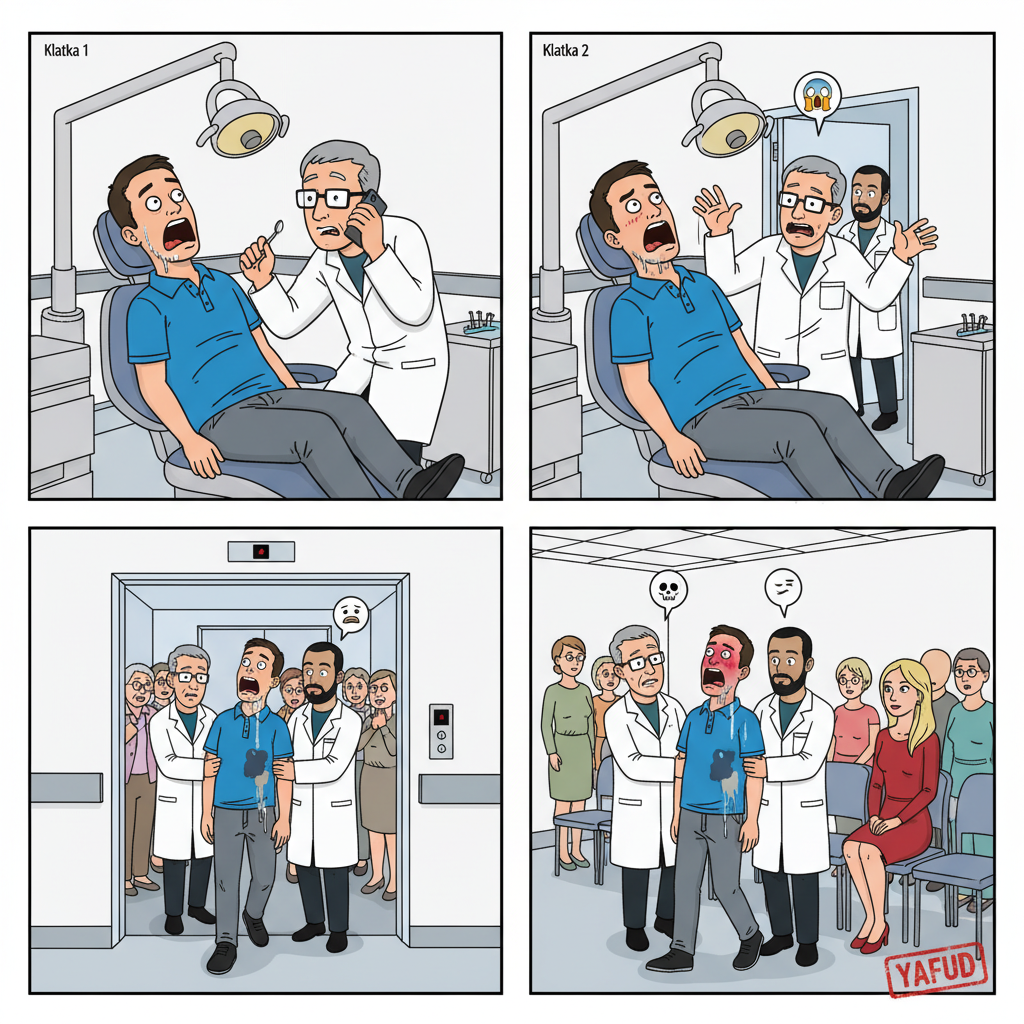 Poszedłem do dentysty na rutynowy przegląd, nic poważnego. Podczas badania tak szeroko otworzyłem usta, że zablokowała mi się szczęka i nie mogłem jej zamknąć. Dentysta nie mógł sobie poradzić i wezwał chirurga z piętra wyżej. Musieli mnie przewieźć windą przez poczekalnię pełną ludzi z rozdziawioną buzią, z której ciekła ślina. W poczekalni siedziała moja była dziewczyna, z którą zerwałem, bo chciałem być 'bardziej poważny'. YAFUD«Poprzednia wpadkaNastępna wpadka »