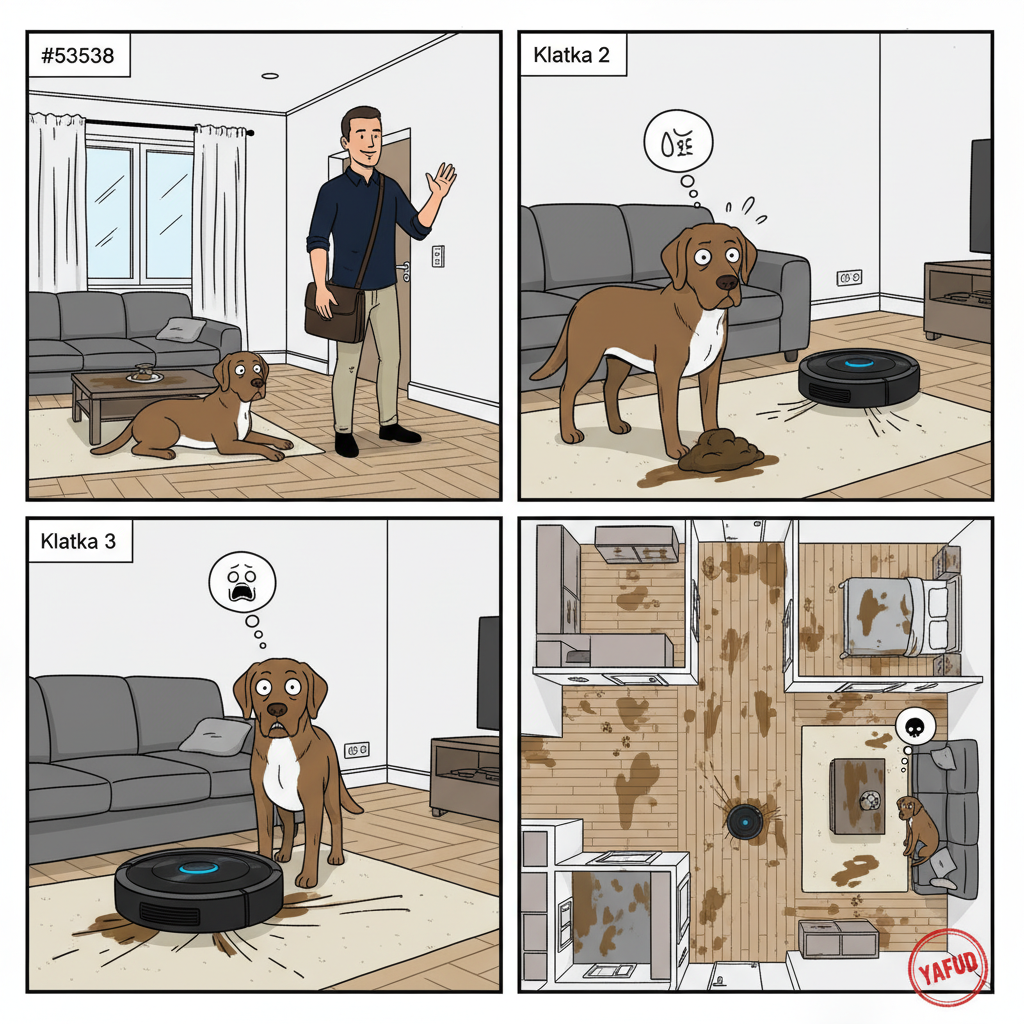 Kupiłem sobie robota sprzątającego, żeby ułatwić życie i mieć czysto po powrocie z pracy. Zapomniałem jednak zamknąć psa w kojcu, a pies miał akurat problemy żołądkowe i załatwił się na środku salonu. Robot sumiennie wjechał w niespodziankę, a następnie kontynuował sprzątanie całego mieszkania zgodnie z harmonogramem. Rozsmarował zawartość po dywanach, parkiecie i listwach w każdym pokoju. YAFUD«Poprzednia wpadka