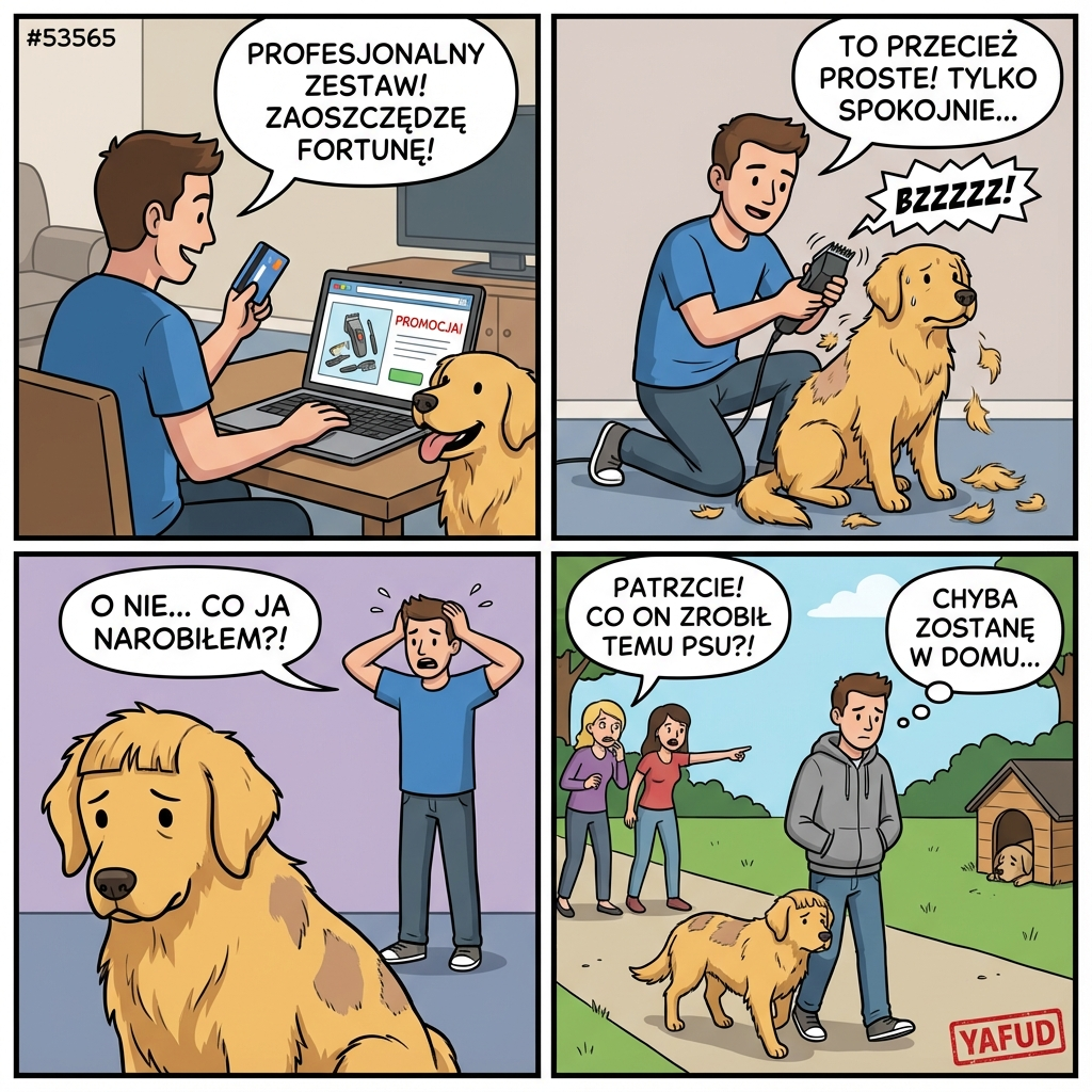 No i zaoszczędziłeś! Teraz pies ma 'artystyczny nieład' na sierści, a ty zaoszczędziłeś na konieczności wychodzenia z domu, bo wstyd.