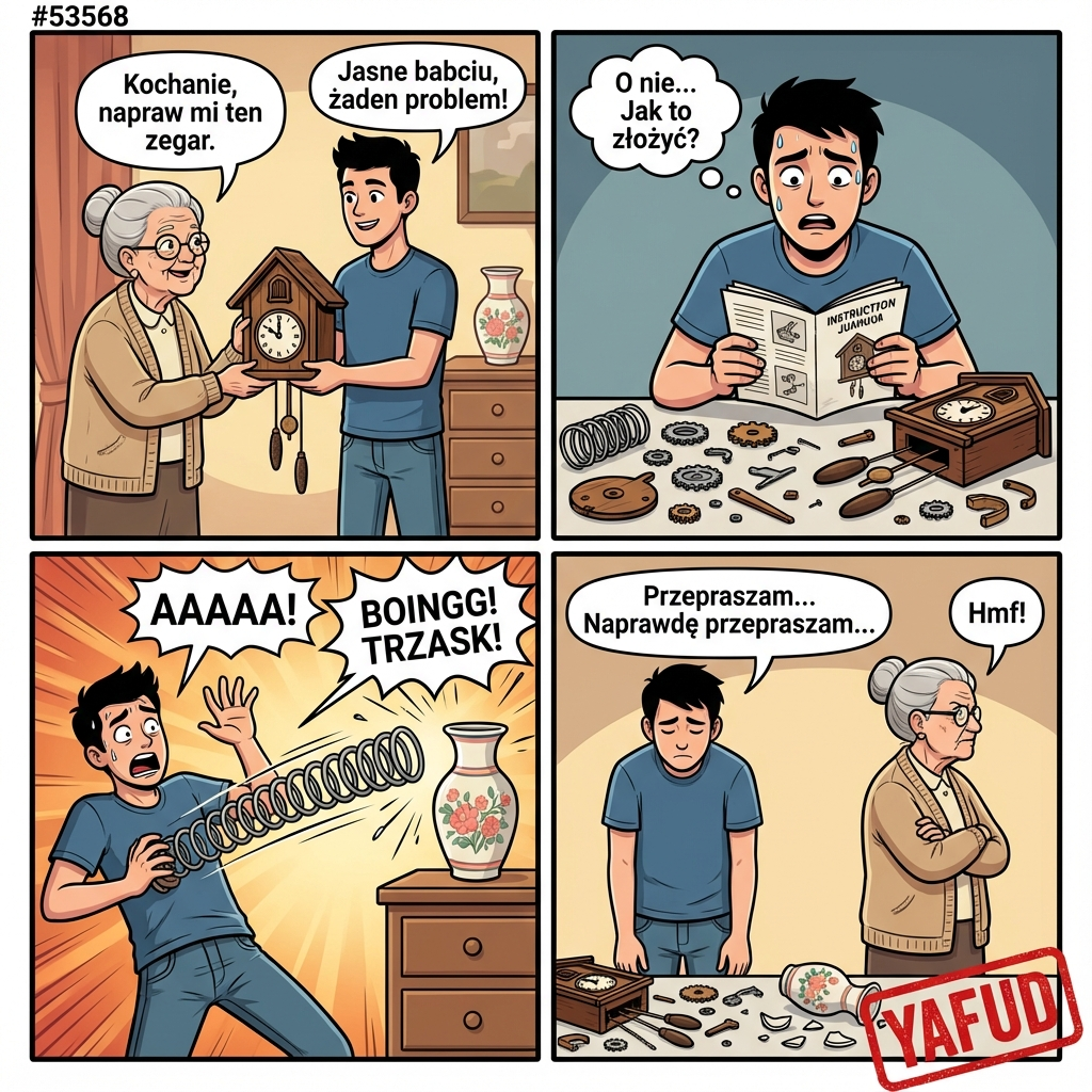 Moja babcia poprosiła mnie o naprawienie jej starego zegara z kukułką. Zamiast go naprawić, rozłożyłem go na części pierwsze i nie potrafiłem złożyć z powrotem. Kiedy próbowałem wcisnąć sprężynę, ta wystrzeliła i zbiła ulubiony wazon babci stojący na komodzie. Teraz mam w domu dwa zepsute antyki i obrażoną babcię. YAFUD«Poprzednia wpadka