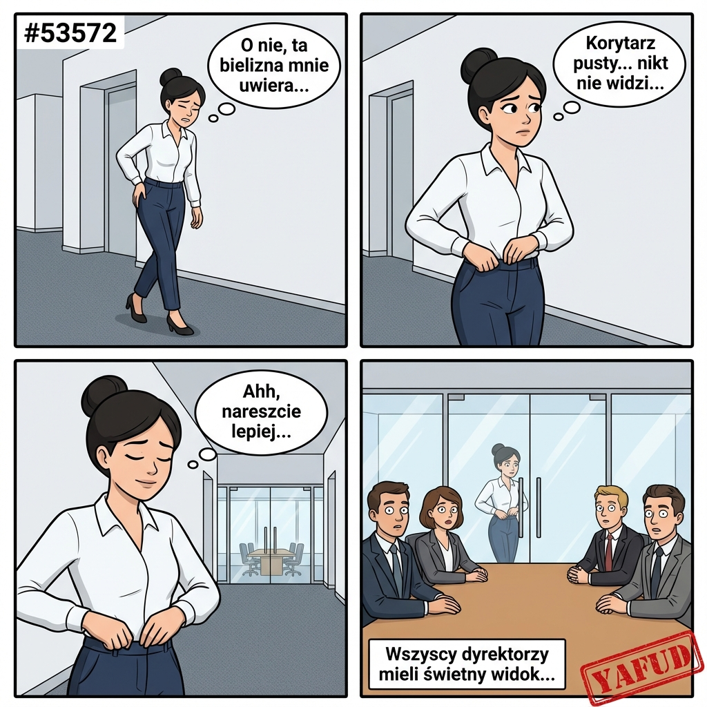 Chciałam dyskretnie poprawić sobie bieliznę, idąc przez biuro, bo strasznie mnie uwierała. Myślałam, że nikt nie widzi, bo korytarz był pusty. Nie zauważyłam, że na końcu korytarza są szklane drzwi do sali konferencyjnej, gdzie trwała narada zarządu. Wszyscy dyrektorzy patrzyli wprost na mnie, jak gmeram sobie w spodniach. YAFUD«Poprzednia wpadkaNastępna wpadka »