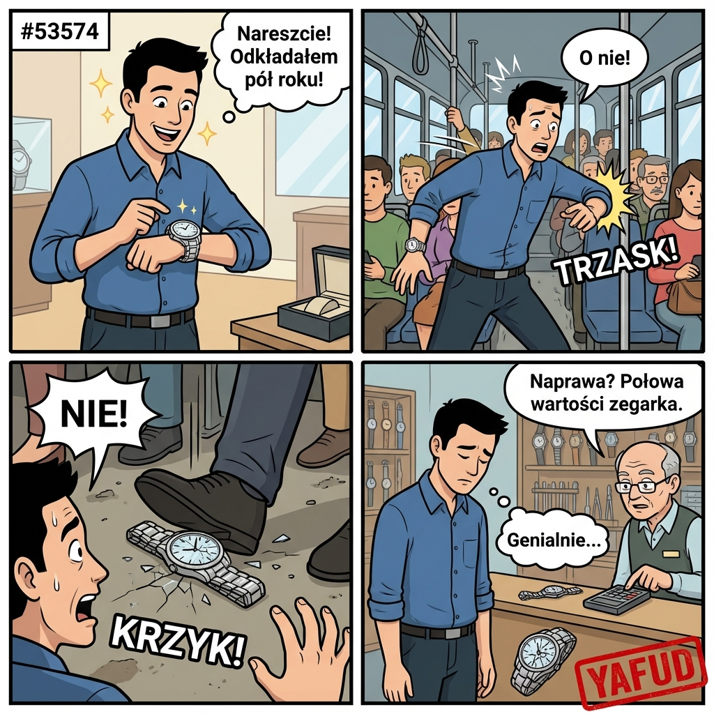 Kupiłem sobie wymarzony zegarek, na który odkładałem od pół roku. Wracając do domu z pracy, zahaczyłem bransoletą o słupek w autobusie przy gwałtownym hamowaniu. Zapięcie puściło, zegarek upadł na podłogę, a zanim zdążyłem go podnieść, ktoś na niego nadepnął. Szkło pękło w drobny mak. Serwis wycenił naprawę na połowę wartości zegarka. YAFUD«Poprzednia wpadka